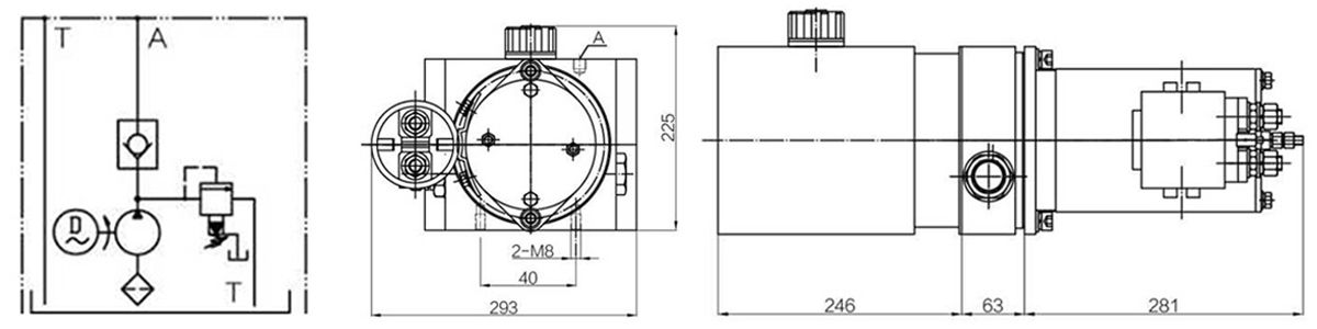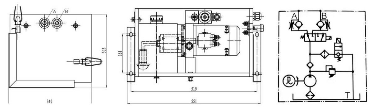 | Модель | Мотор | Рабочий объем насоса (куб. см/об) | Емкость бака (л) | Давление (мПа) | Метод монтажа | Маслопровод |