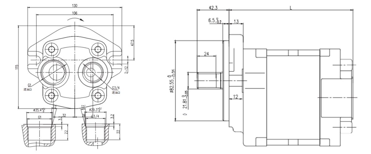 | Модель | Расход (мл/об) | Давление (бар) | Скорость (об/мин) | L (мм) | Впускное отверстие | Выпускное отверстие | |||